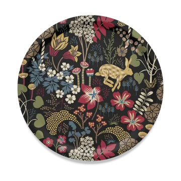 Lyckeflykt dienblad Ø31 cm van Arvidssons Textil is vervaardigd uit FSC-gecertificeerd berkenfineer met een bloemenpatroon ontworpen door Hanna Werning. Het ronde dienblad functioneert zowel als praktisch serveeroppervlak als een decoratief element in de keuken.