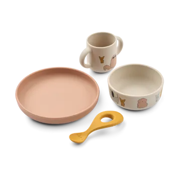 Het Vivi printed serviesset 4-delig van Liewood is gemaakt van duurzaam silicone en nylon voor veilige en duurzame maaltijden. Dit serviesset bevat een beker, een schaal, een bord en een lepel – allemaal ontworpen voor de behoeften van kleine kinderen. Perfect om elke maaltijd eenvoudig, veilig en kleurrijk te maken.