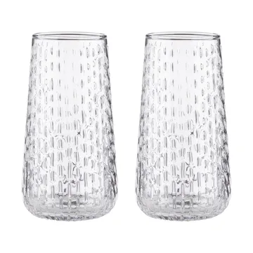 Syksy long tumbler glas 2-pack van Marimekko zijn twee elegante drinkglazen van glas, ontworpen door Matti Klenell. De langwerpige vorm geeft een moderne en uitnodigende uitstraling die de tafelsetting versterkt, of je nu water bij het ontbijt of cocktails 's avonds serveert. Perfect voor wie een artistiek en functioneel detail op tafel wil.