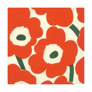 De papieren servetten met het iconische Unikko-patroon van Marimekko. Unikko betekent klaproos in het Fins en dat is precies wat het abstracte bloemmotief op het servet voorstelt. Maija Isola ontwierp het patroon in 1964 als protest tegen een uitspraak van Armi Ratia, de oprichter van Marimekko, die inhield dat Marimekko nooit iets met een bloemmotief zou produceren. Daarom is Unikko uitgegroeid tot een symbool van kracht, moed en altijd in jezelf blijven geloven.