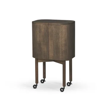 Loud serveertrolley op wielen van Northern is een opvallende kast ontworpen door Färg & Blanche. Met gladde contouren en een lichaam bekleed met gepolijst aluminiumlaminaat ontstaat een verblindend spiegelend effect dat de aandacht trekt, terwijl het tafelblad en de poten in gerookt eik warmte en karakter geven. De kast staat op metalen wielen, waardoor hij gemakkelijk te verplaatsen is bij het dekken van de tafel of wanneer je de ruimte wilt veranderen. Een zelfverzekerde, functionele toevoeging aan huis die design en bruikbaarheid combineert — perfect voor wie op zoek is naar een sterke en persoonlijke uitstraling.