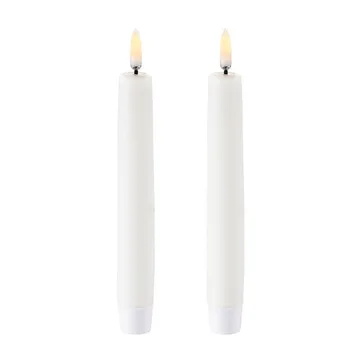 Uyuni Led Dinerkaarsen wit 2-pack van het Deense Uyuni Lighting heeft alles wat gewone kaarsen ook hebben - maar dan veiliger en met een langere gebruiksduur. De licht golvende en gepatenteerde 3D-vlam van de kaarsen in combinatie met het paraffine behandelde oppervlak maken de LED-kaarsen realistisch en zorgen voor dezelfde zachte en uitnodigende sfeer in de kamer als echte brandende kaarsen. Combineer de dinerkaarsen met de afstandsbediening van Uyuni om bijvoorbeeld de dimfunctie te gebruiken en een timer in te stellen op 4, 6, 8 of 10 uur in plaats van de ingebouwde 6-uur timer van de kaarsen.